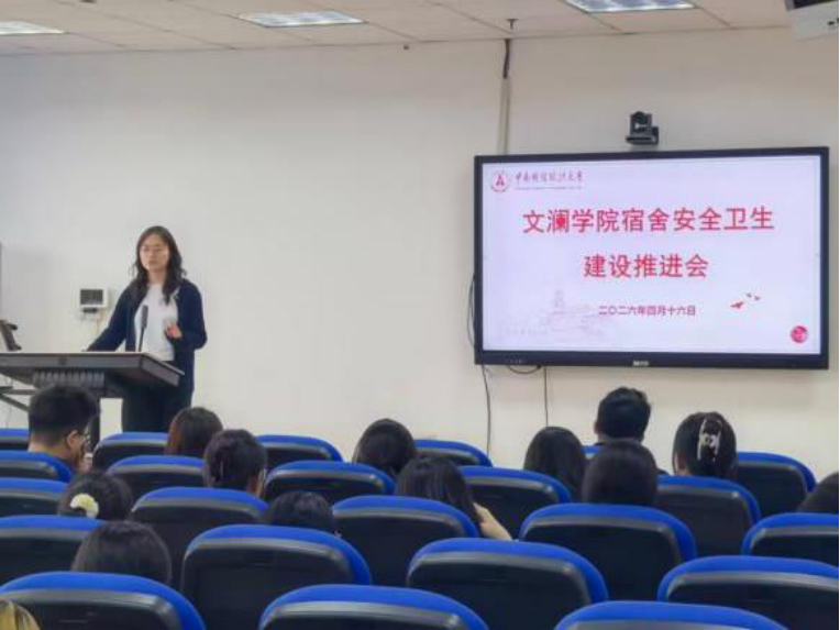 (通讯员:岳俊芳 周思琪)为进一步加强学生宿舍安全卫生管理,切实排查整治安全隐患,营造安全整洁、文明有序的住宿环境,4月16日中午12:35,文澜学院于文澴楼809教室召开学生宿舍安全卫生建设推进会。本次推进会以安全防范与卫生建设为核心,通过知识宣讲与管理部署,强化学生骨干责任担当,推动宿舍安全卫生管理规范化、常态化,筑牢校园安全健康防线。会议由余利老师主持,孙晨警官、周思琪老师受邀宣讲,全体宿舍长、各班生活委员及学生会生活权益部成员参会。